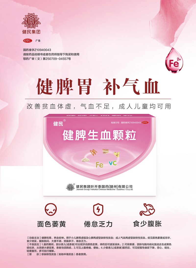 健脾和胃,养血安神。用于小儿脾胃虚弱及心脾两虚型缺铁性贫血;成人气血两虚型缺铁性贫血;症见面色萎黄或无华,食少纳呆,腹胀脘闷,大便不调,烦躁多汗,倦怠乏力。